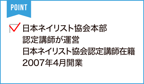 完全予約制のネイルサロン&スクールとして、様々な世代の女性の上品で大人かわいいネイルをご提案。ゆったり寛げるネイルサロンで、上品な大人可愛いほめられネイルに。スクールはJNA認定講師・INAジェルネイル技能検定審査官・指導員がマンツーマンレッスンであなたを目標へサポートします。皆様のご来店を心よりお待ちしております。