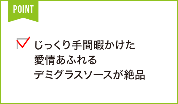 ハンバーグ、オムライスが一番人気のアットホームな洋食店。じっくり手間暇かけた愛情あふれるデミグラスソースが決め手です。浜松市内で提供しているお店は少ない、名物タンシチューは、牛タンを約7時間ソースで煮込んでおり大変やわらかく、口の中でとろける美味しさです。他にも、エビフライやカレー、グラタン、ドリアなど、洋食の王道メニューが揃っています。