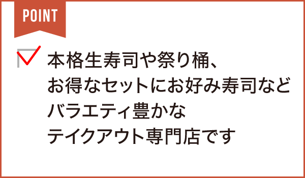 本格生寿司をテイクアウトで。お祝いごとやご家族が集まる日などにぜひご利用ください。