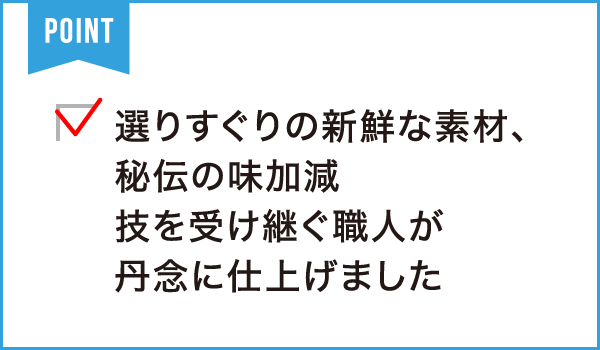 炊くことで日持ちや栄養価が上がると昔から作られてきた佃煮。じっくりコトコト炊きあげられた懐かしい味わいの惣菜。素材の持ち味を活かした伝統の味で、ほっと安心する食卓のお手伝いをします。伝統の味も、新しく生み出す味も使用する原料は選りすぐりの新鮮なものだけ。その滋味を活かすため、不必要な添加物を使わず素材本来の持ち味を大切にしています。