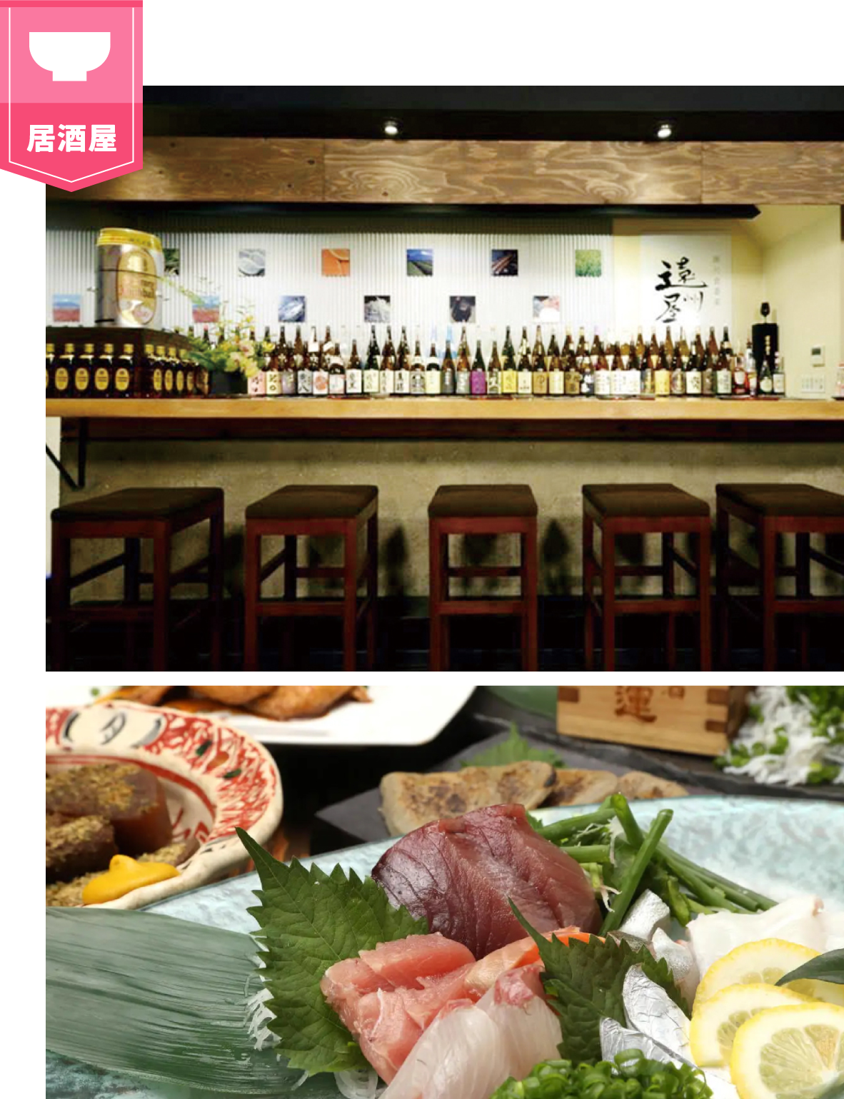 静岡おでんやしらす地鶏、御前崎港直送の地魚。静岡ものなら何でも揃ってます。御前崎港直送の超新鮮な鮮魚、もち鰹や御前崎のブランド鰆波乗り鰆も掛川随一の入荷率です。地酒、焼酎、プレミアムなお酒も豊富です。県内県外日本酒50種以上、焼酎常時50種以上。カウンター席からの眺めは圧巻!