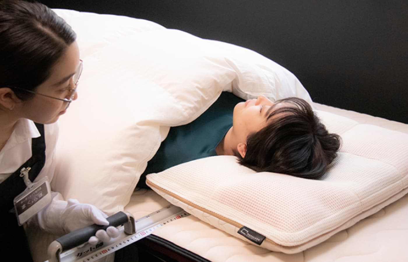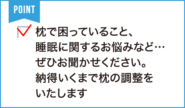 枕でお悩みのみなさまに快眠を提供できるよう、一人ひとりミリ単位で違う体型に合わせて枕をお客さまと一緒にお作りしています。