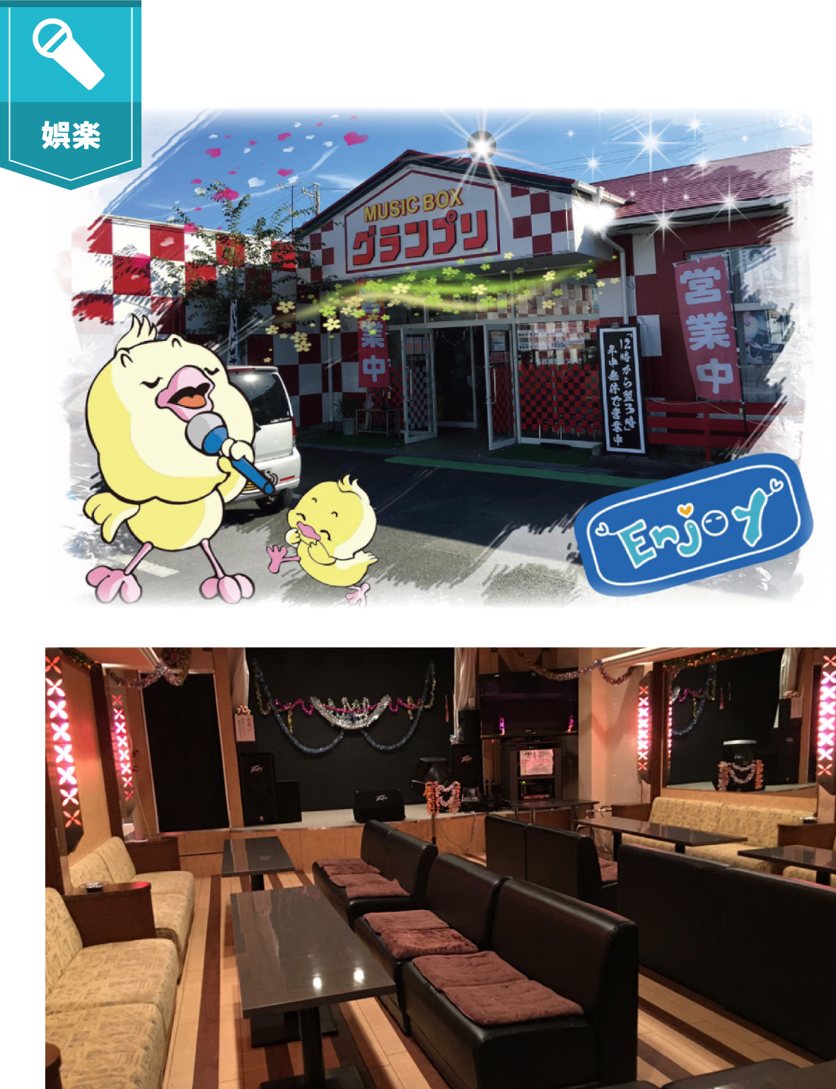 郊外店ゆえに浜松一目立つ店舗にしようと思い立ち、紅白のチェック柄というド派手な外観になりました!「チェーン店よりお安く」そして「カラオケが大好きな方々の為に」をモットーに、笑顔で明るいお店作りに全力で努力いたします!歌唱レッスンも承っています。各種大会優勝経験多数で全国TOP3入賞の講師が、ご希望のお客様に歌唱レッスンを行っております。「やる気の赤」で、皆様のお越しを心よりお待ちしております!