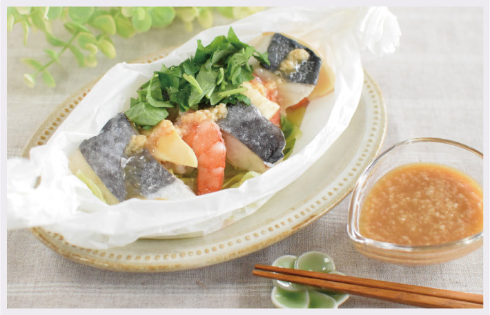 鰆・竹の子・春キャベツといった旬の食材をクッキングシートで包んで蒸しました。旨味と甘みがそのまま残り、甘酒を使ったソースともよく合います。